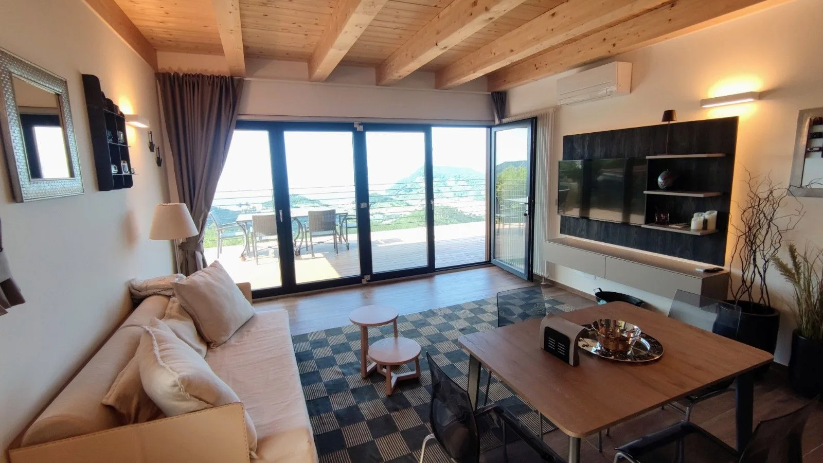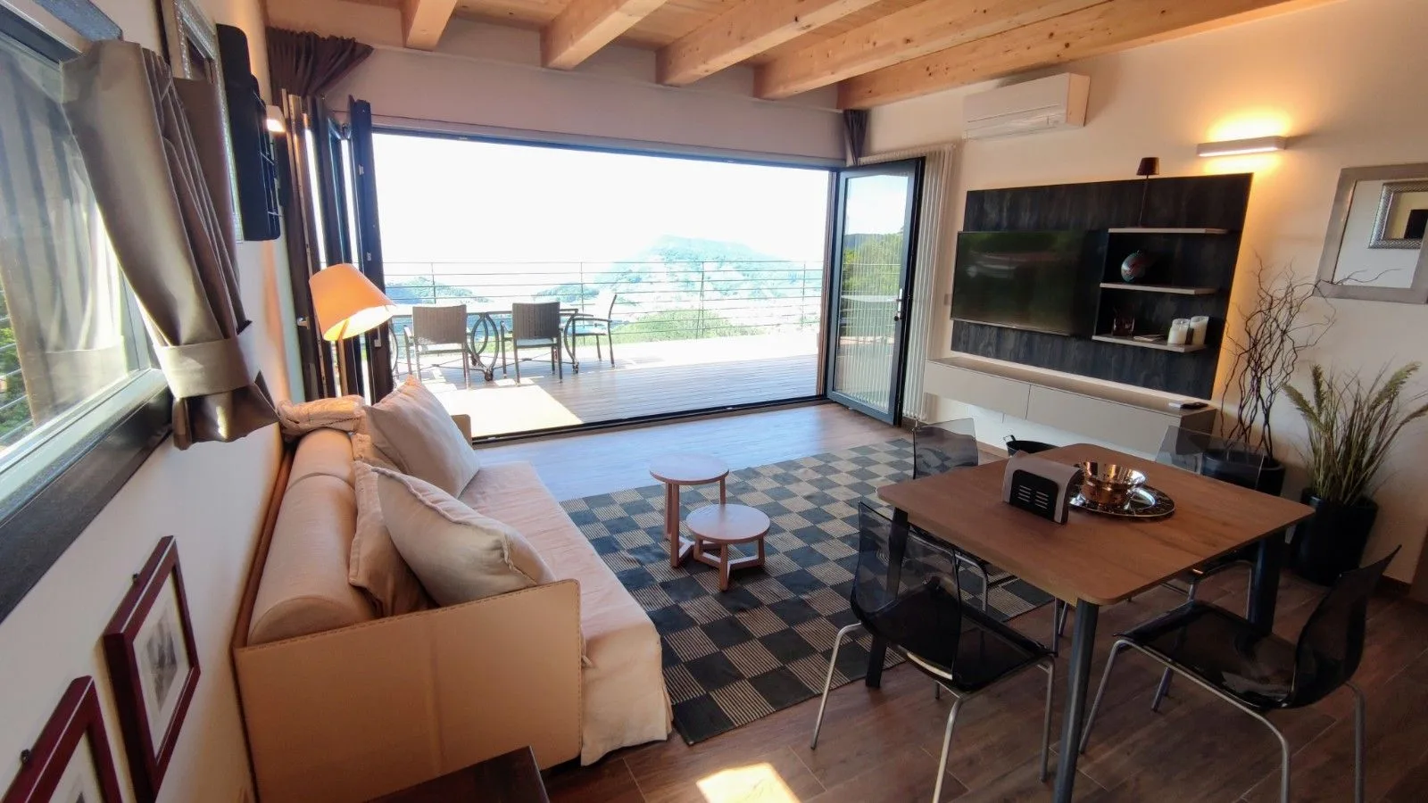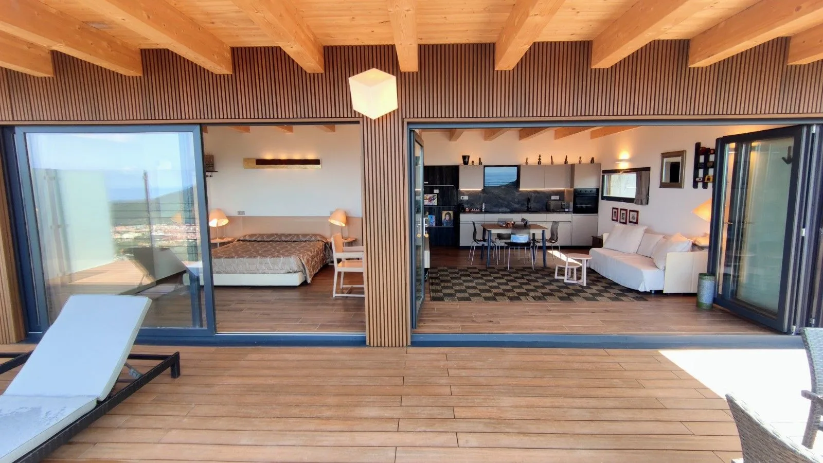 Elegant 58 m² apartment featuring stunning panoramic glass walls in both the living area (foldable windows) and the bedroom (sliding doors).