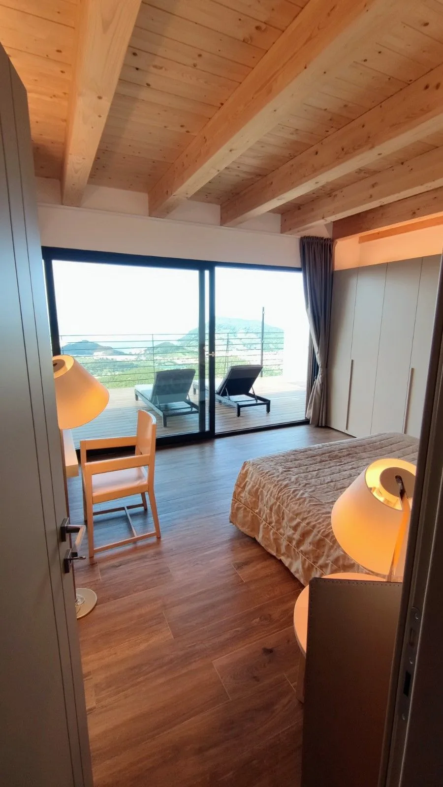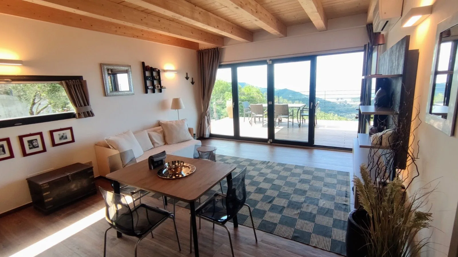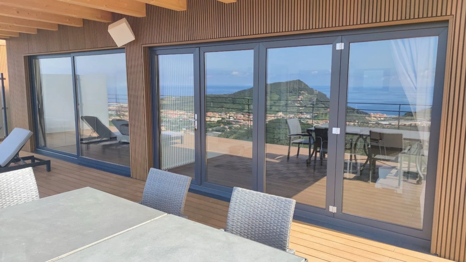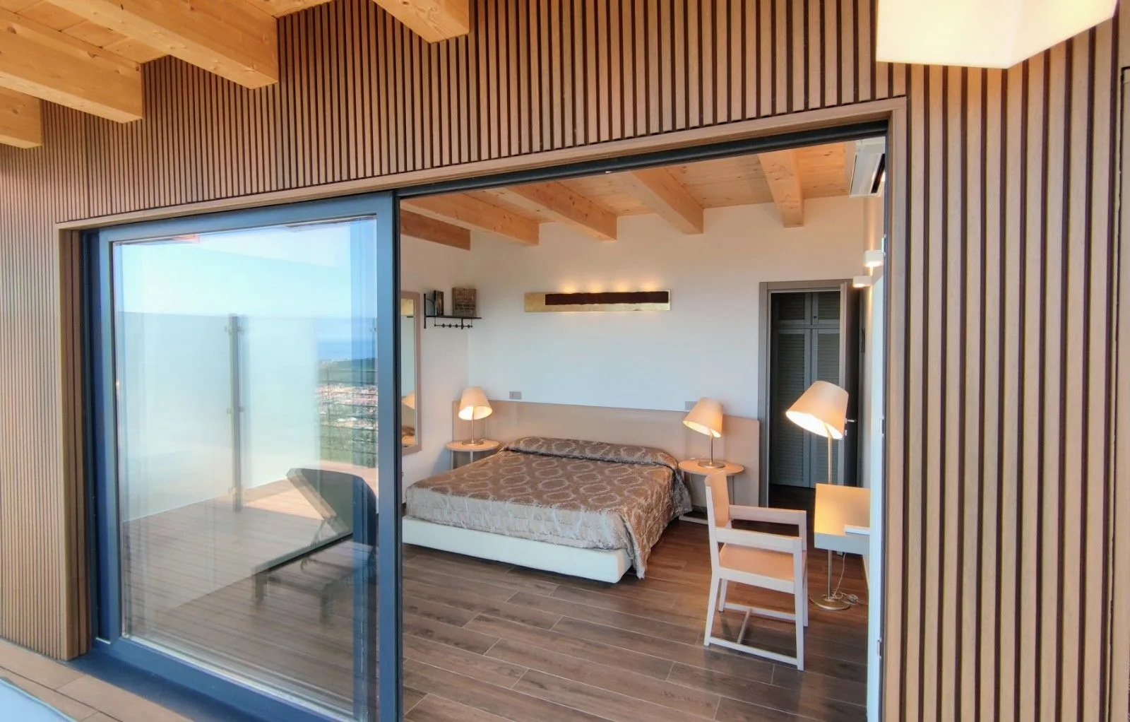 Elegant 58 m² apartment featuring stunning panoramic glass walls in both the living area (foldable windows) and the bedroom (sliding doors).