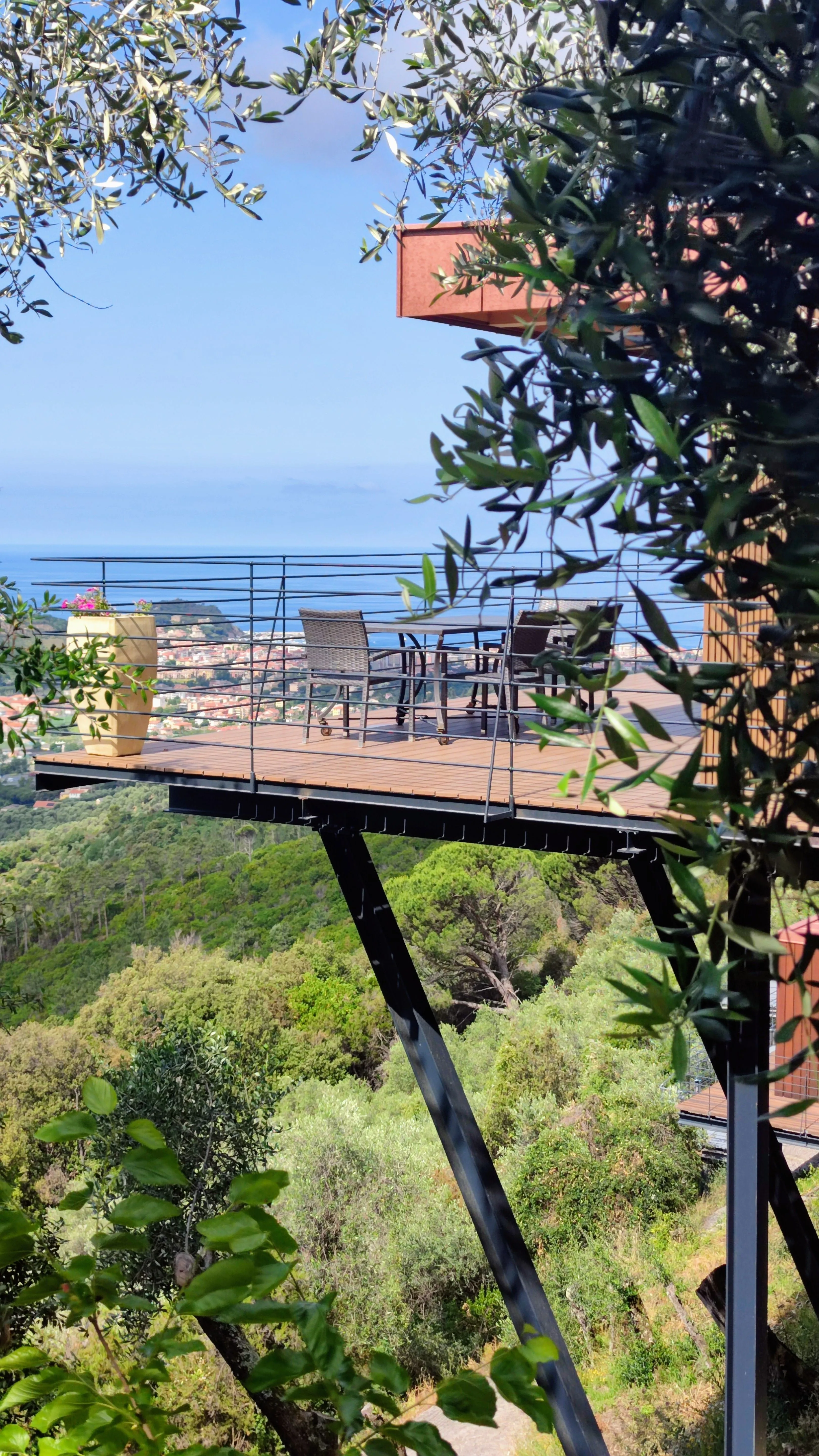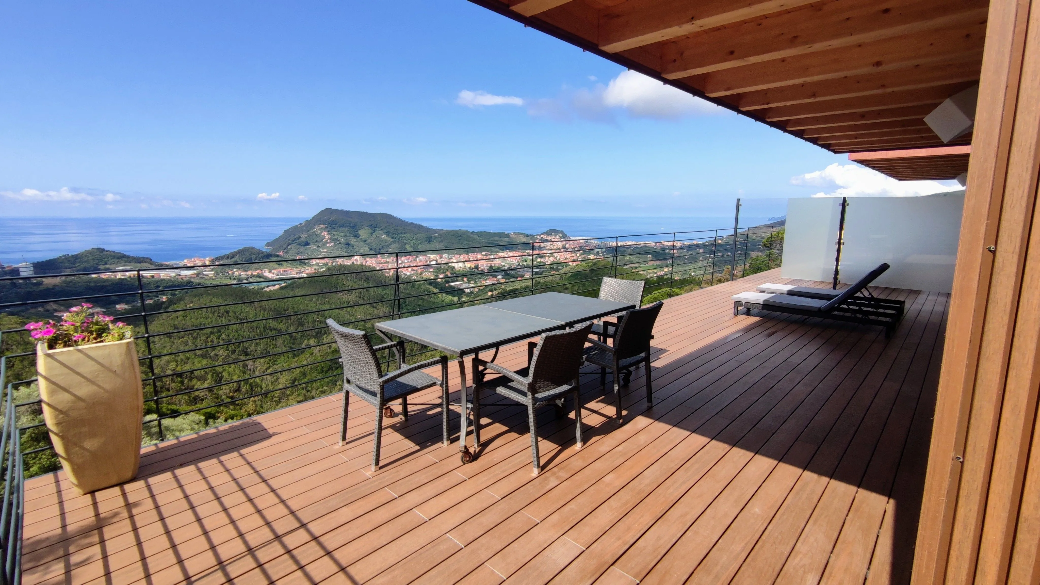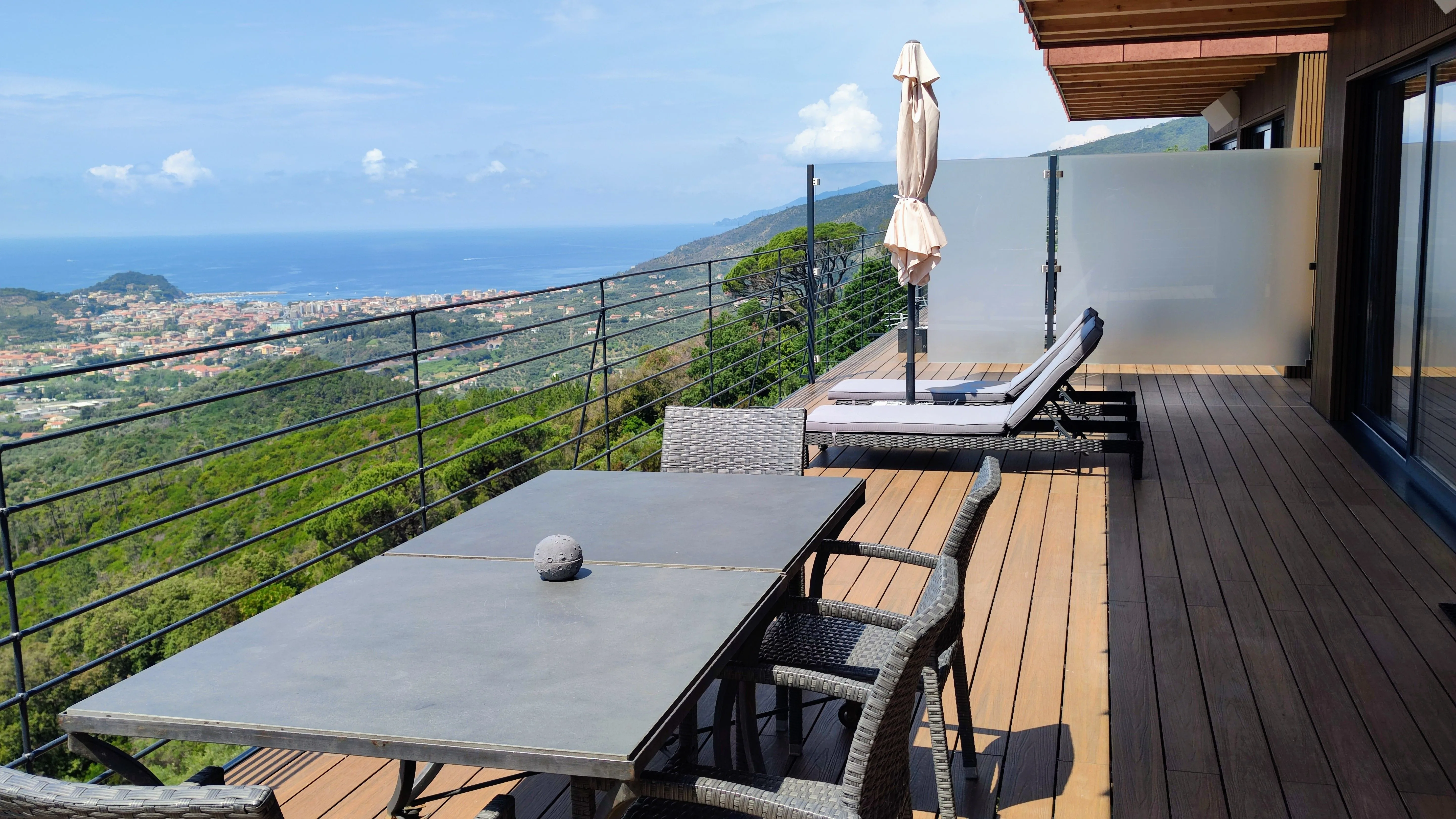 40 m² panoramic terrace overlooking the Sestri Levante peninsula and the entire Tigullio Gulf, furnished with 2 sun loungers and slate tables with 4 chairs. Access via a flight of stairs.