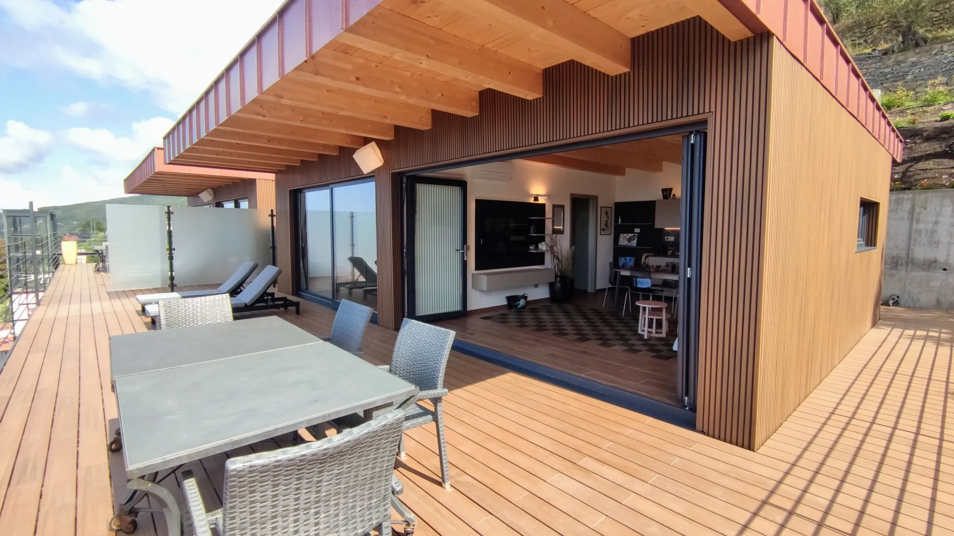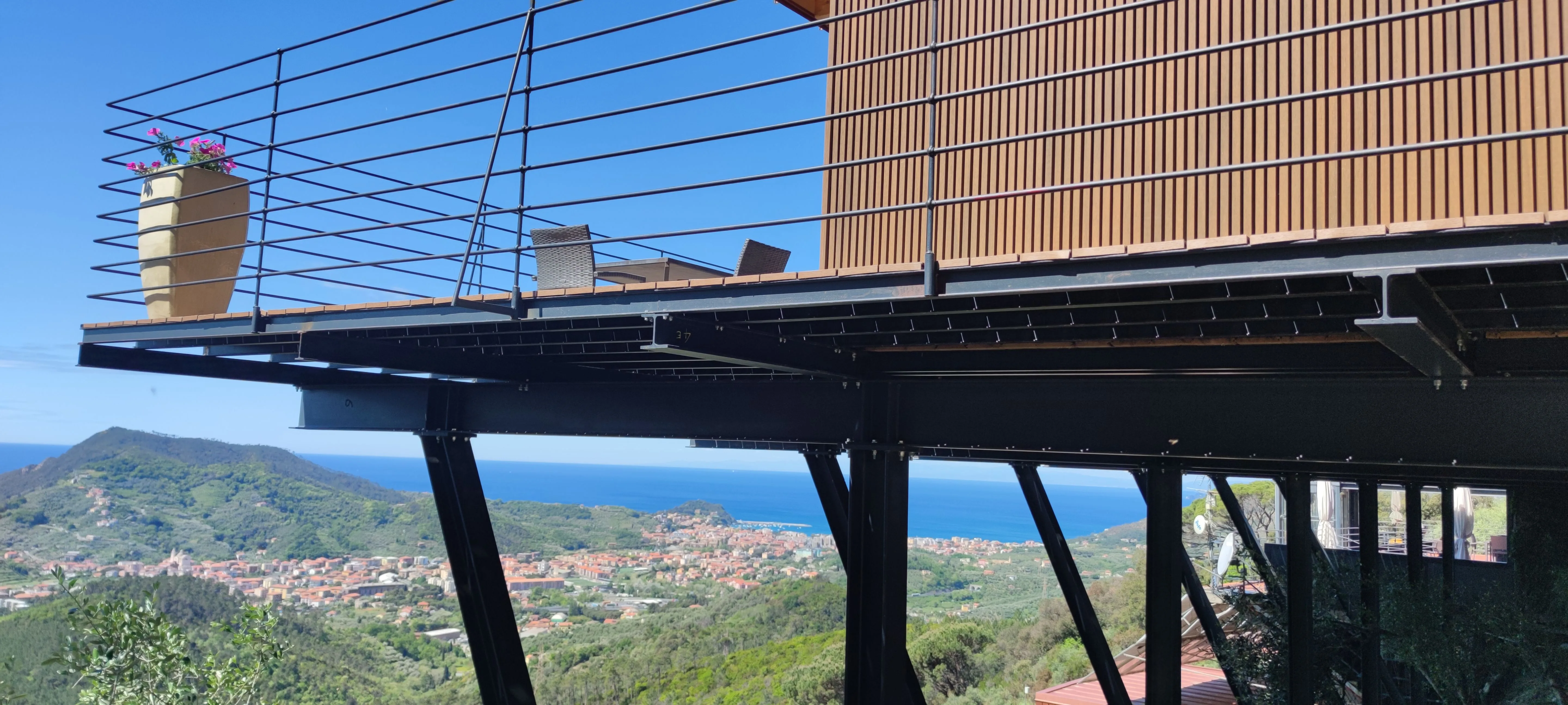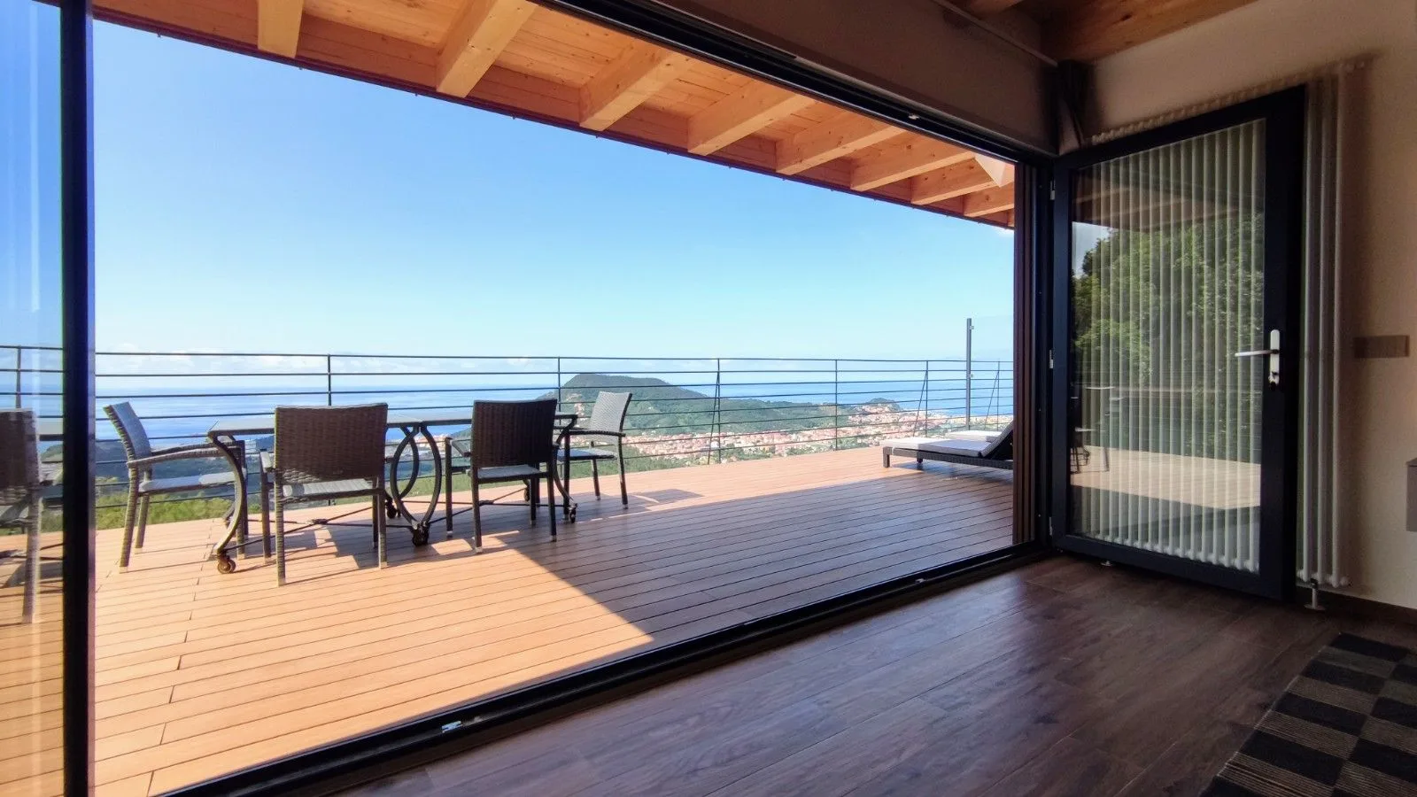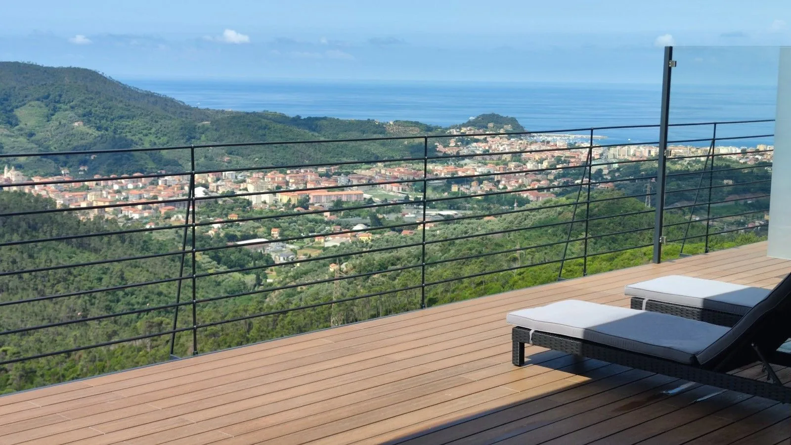 40 m² panoramic terrace overlooking the Sestri Levante peninsula and the entire Tigullio Gulf, furnished with 2 sun loungers and slate tables with 4 chairs. Access via a flight of stairs.