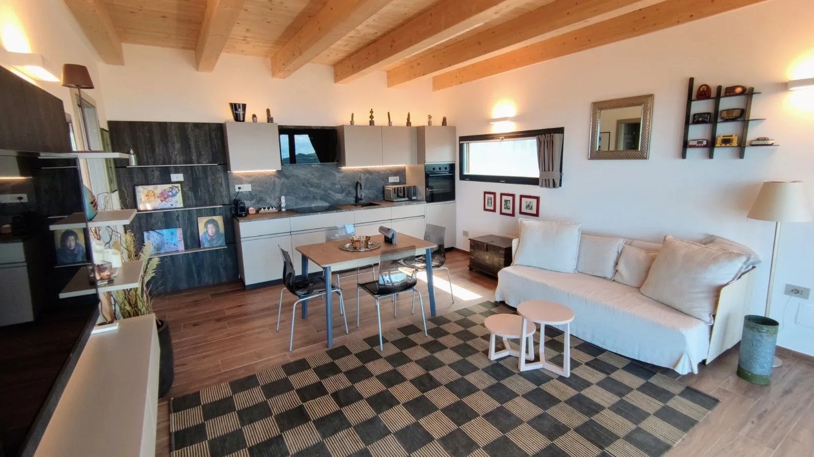 Sleeping area: king-size bed 180×200 cm with 25 cm mattress, Smart TV 50", air conditioning.